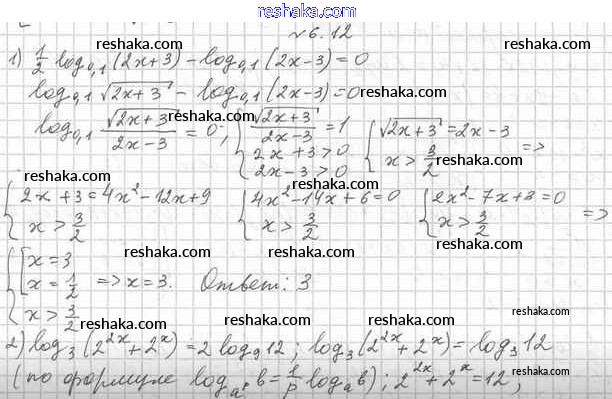 Представляем вам сборники по Алгебре, с готовыми ответами к Учебнику Мерзляк школьной программы для учеников одиннадцатый класса. Это не просто гдз с ответом, а с подсказками, как верно решить §6. Логарифмические уравнения 6.12. Проверяй домашку с умом и получай высший балл!