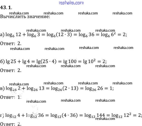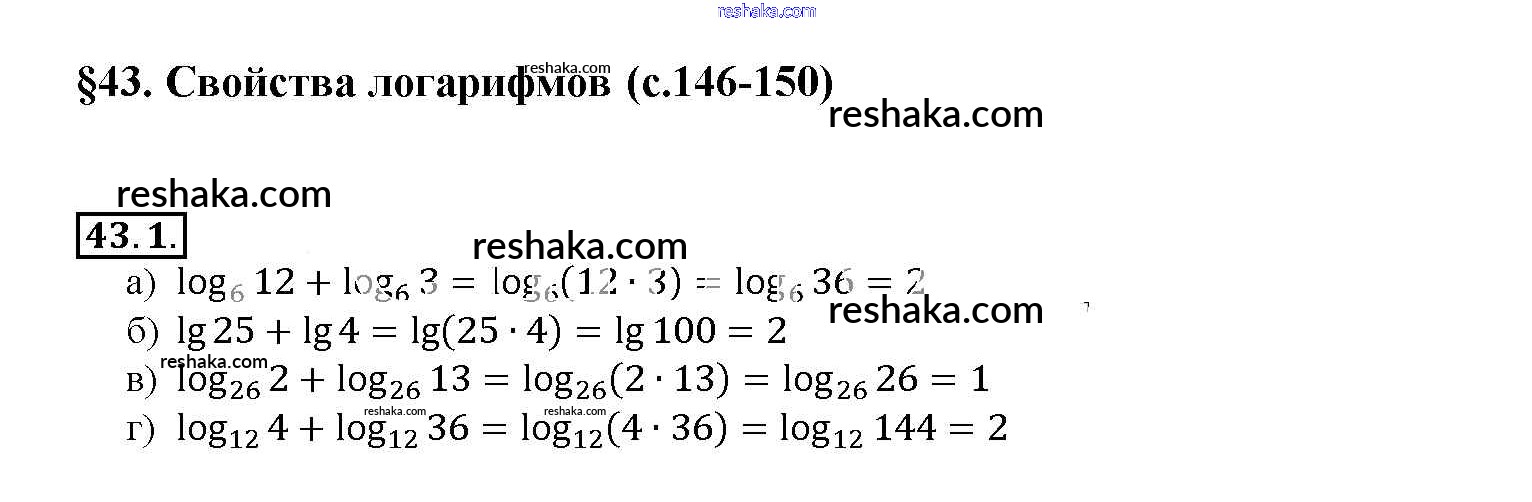 Представляем вам сборники по Алгебре, с готовыми ответами к Задачнику Мордкович школьной программы для учеников десятый-одиннадцатый класса. Это не просто гдз с ответом, а с подсказками, как верно решить §43. Свойства логарифмов Глава 7 43. 1. Проверяй домашку с умом и получай высший балл!
