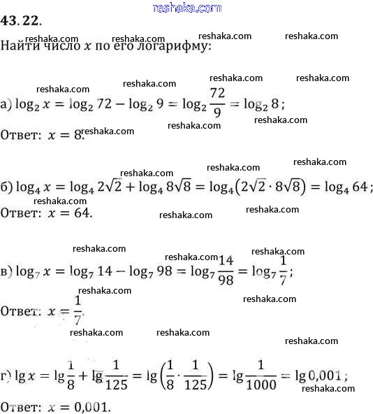 Представляем вам сборники по Алгебре, с готовыми ответами к Задачнику Мордкович школьной программы для учеников десятый-одиннадцатый класса. Это не просто гдз с ответом, а с подсказками, как верно решить §43. Свойства логарифмов Глава 7 43. 22. Проверяй домашку с умом и получай высший балл!