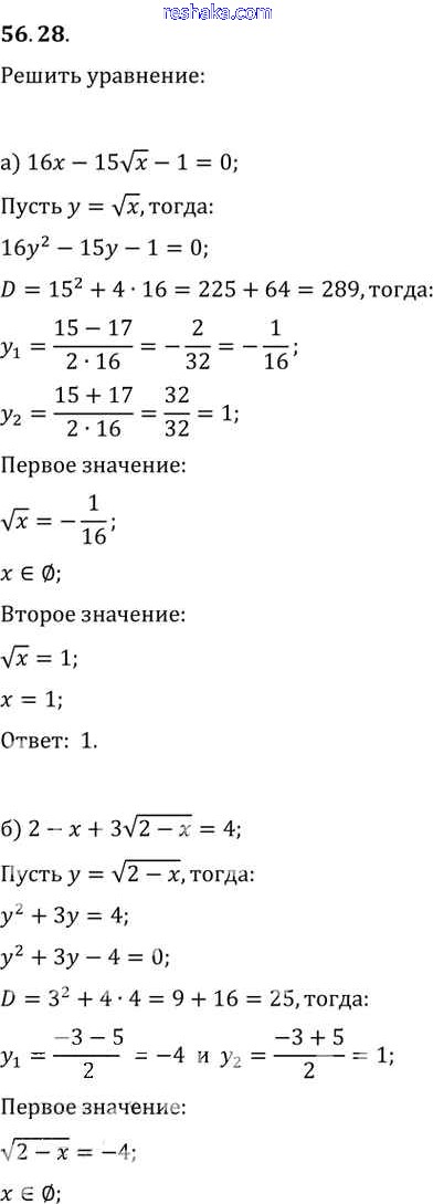 Представляем вам сборники по Алгебре, с готовыми ответами к Задачнику Мордкович школьной программы для учеников десятый-одиннадцатый класса. Это не просто гдз с ответом, а с подсказками, как верно решить §56. Общие методы решения уравнений Глава 10 56. 28. Проверяй домашку с умом и получай высший балл!