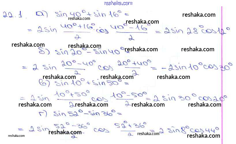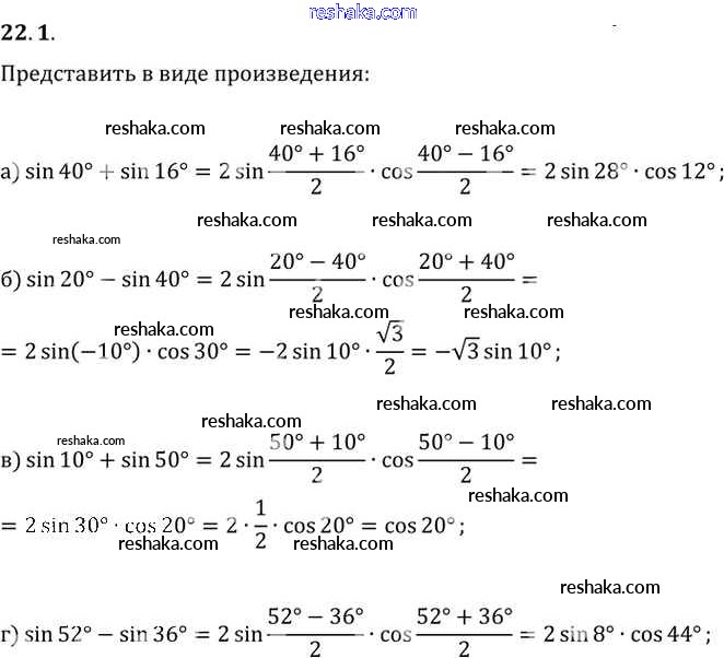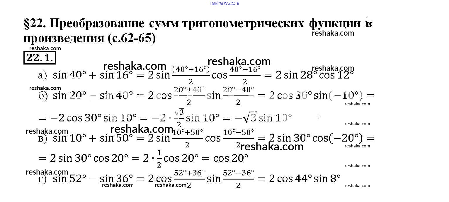 Представляем вам сборники по Алгебре, с готовыми ответами к Задачнику Мордкович школьной программы для учеников десятый-одиннадцатый класса. Это не просто гдз с ответом, а с подсказками, как верно решить §22. Преобразование суммы тригонометрических функций в произведения Глава 4 22. 1. Проверяй домашку с умом и получай высший балл!