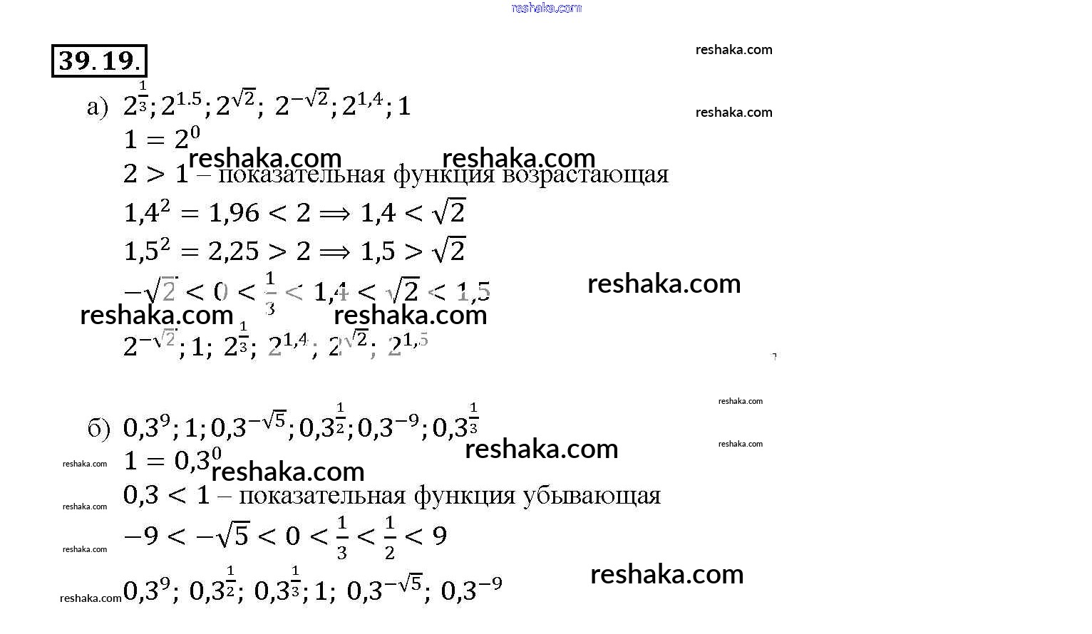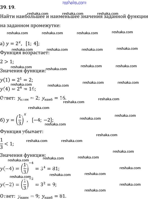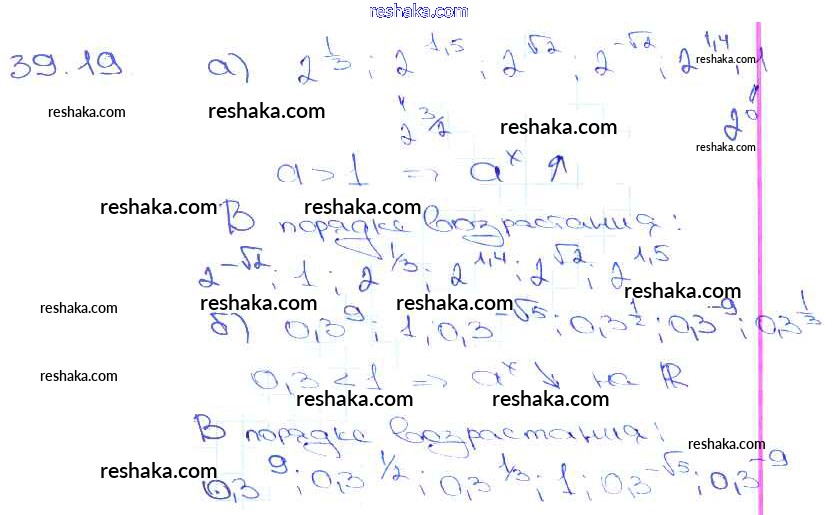 Представляем вам сборники по Алгебре, с готовыми ответами к Задачнику Мордкович школьной программы для учеников десятый-одиннадцатый класса. Это не просто гдз с ответом, а с подсказками, как верно решить §39. Показательная функция, ее свойства и график Глава 7 39. 19. Проверяй домашку с умом и получай высший балл!