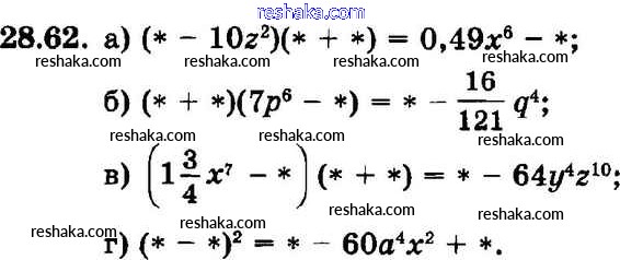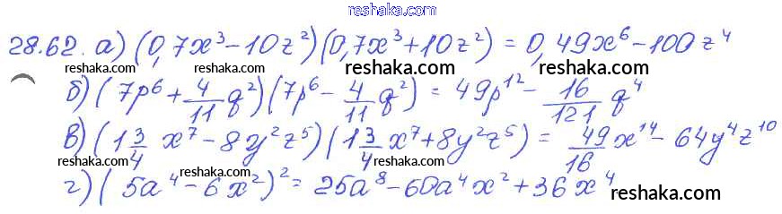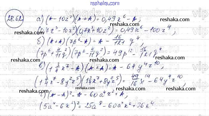 Представляем вам сборники по Алгебре, с готовыми ответами к Задачнику Мордкович школьной программы для учеников седьмой класса. Это не просто гдз с ответом, а с подсказками, как верно решить § 28. Формулы сокращенного умножения Глава 6 62. Проверяй домашку с умом и получай высший балл!