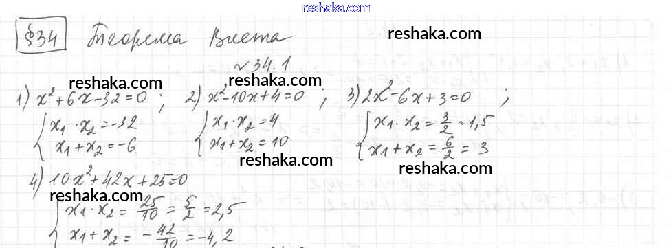 Представляем вам сборники по Алгебре, с готовыми ответами к Учебнику Мерзляк школьной программы для учеников восьмой класса. Это не просто гдз с ответом, а с подсказками, как верно решить §34. Теорема Виета Глава 6. Квадратные уравнения 1. Проверяй домашку с умом и получай высший балл!
