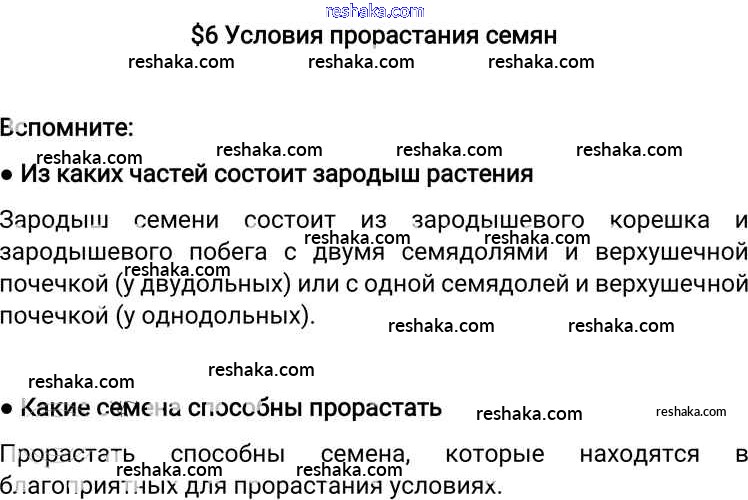 Представляем вам сборники по Биологии, с готовыми ответами к Учебнику Пономарева школьной программы для учеников шестой класса. Это не просто гдз с ответом, а с подсказками, как верно решить §6. Условия прорастания семян Вспомните. Проверяй домашку с умом и получай высший балл!