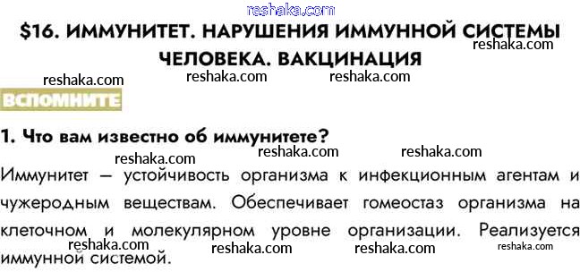 Представляем вам сборники по Биологии, с готовыми ответами к Учебнику Пасечник школьной программы для учеников восьмой класса. Это не просто гдз с ответом, а с подсказками, как верно решить Вспомните §16. Иммунитет. Нарушения иммунной системы человека. Вакцинация 1. Проверяй домашку с умом и получай высший балл!