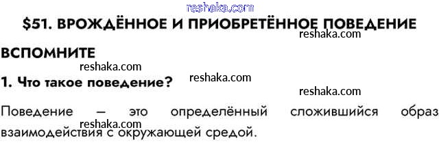 Представляем вам сборники по Биологии, с готовыми ответами к Учебнику Пасечник школьной программы для учеников восьмой класса. Это не просто гдз с ответом, а с подсказками, как верно решить Вспомните §51. Врождённое и приобретённое поведение 1. Проверяй домашку с умом и получай высший балл!