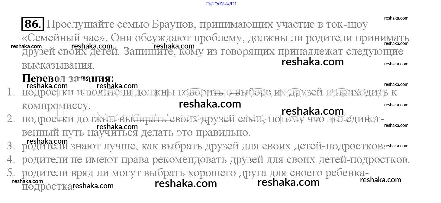 Представляем вам сборники по Английскому языку, с готовыми ответами к Учебнику Биболетова школьной программы для учеников десятый класса. Это не просто гдз с ответом, а с подсказками, как верно решить Unit 2. Talking on family matters 86. Проверяй домашку с умом и получай высший балл!