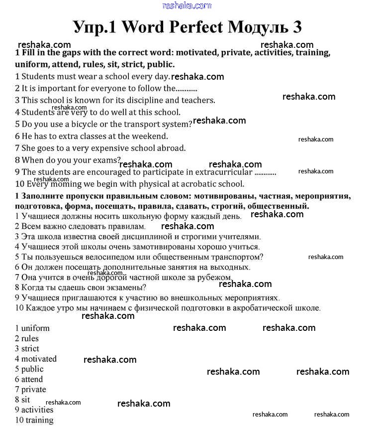 Представляем вам сборники по Английскому языку, с готовыми ответами к Учебнику Афанасьева школьной программы для учеников десятый класса. Это не просто гдз с ответом, а с подсказками, как верно решить Module 3 Word Perfect 1. Проверяй домашку с умом и получай высший балл!