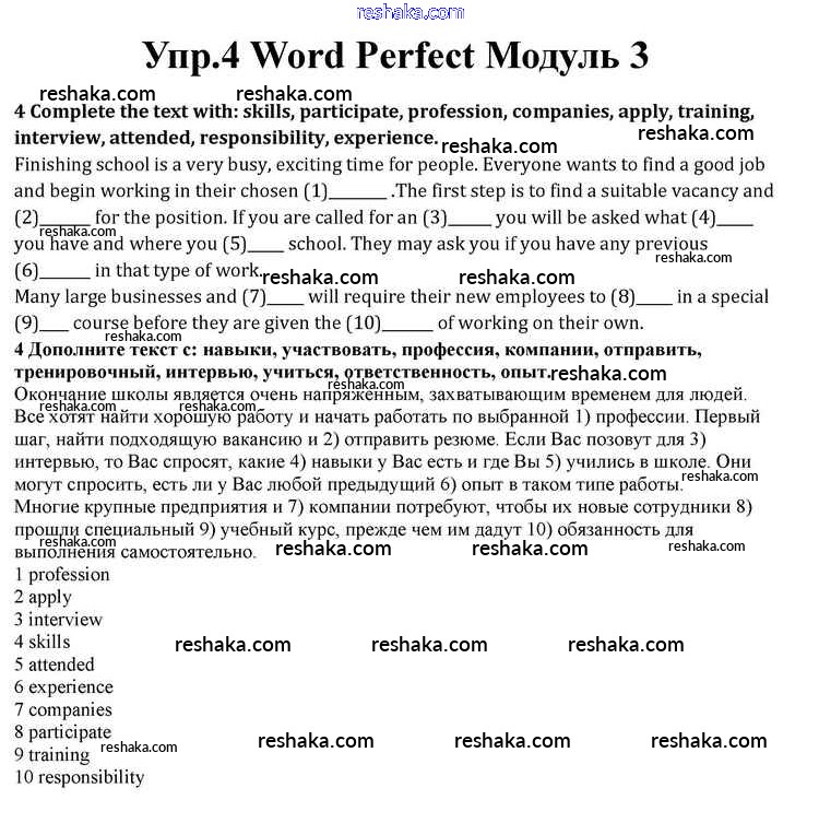 Представляем вам сборники по Английскому языку, с готовыми ответами к Учебнику Афанасьева школьной программы для учеников десятый класса. Это не просто гдз с ответом, а с подсказками, как верно решить Module 3 Word Perfect 4. Проверяй домашку с умом и получай высший балл!