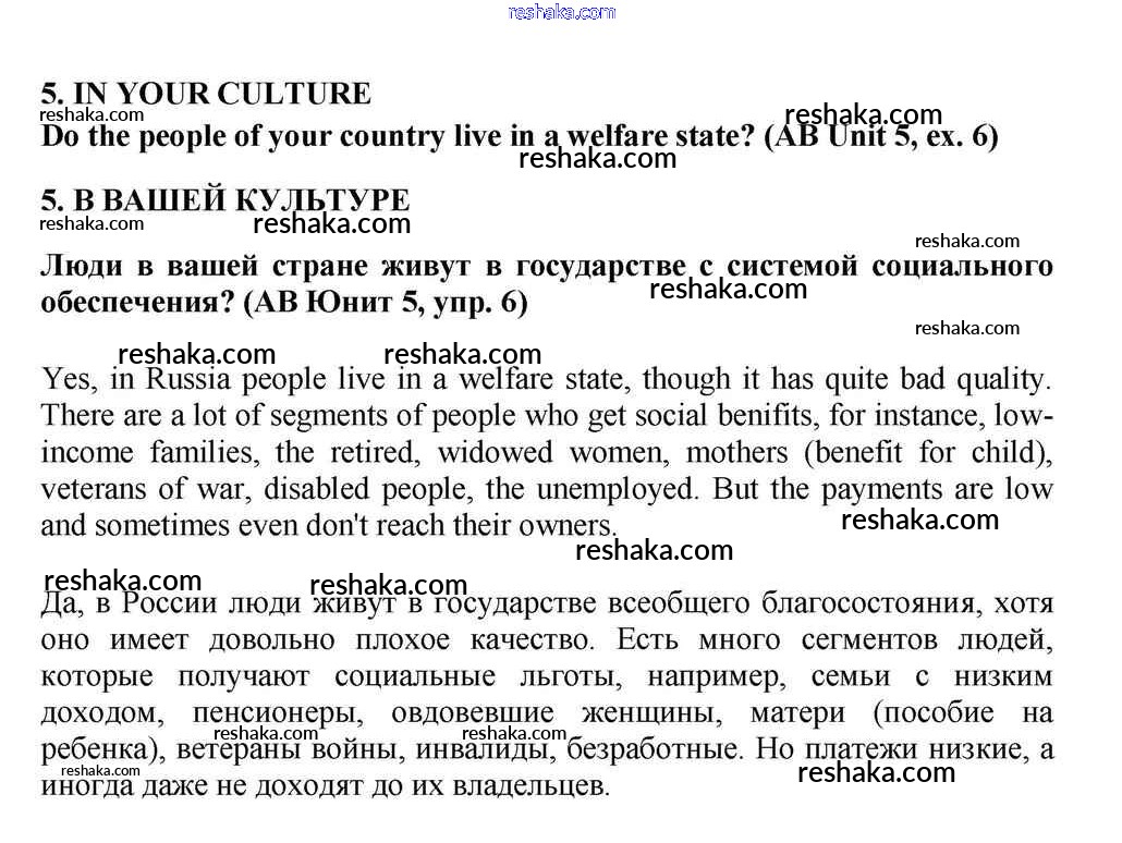 Представляем вам сборники по Английскому языку, с готовыми ответами к Учебнику Кузовлев школьной программы для учеников десятый-одиннадцатый класса. Это не просто гдз с ответом, а с подсказками, как верно решить Lesson 5 Unit 5. Is the System of Social Welfare Fair? 5. Проверяй домашку с умом и получай высший балл!