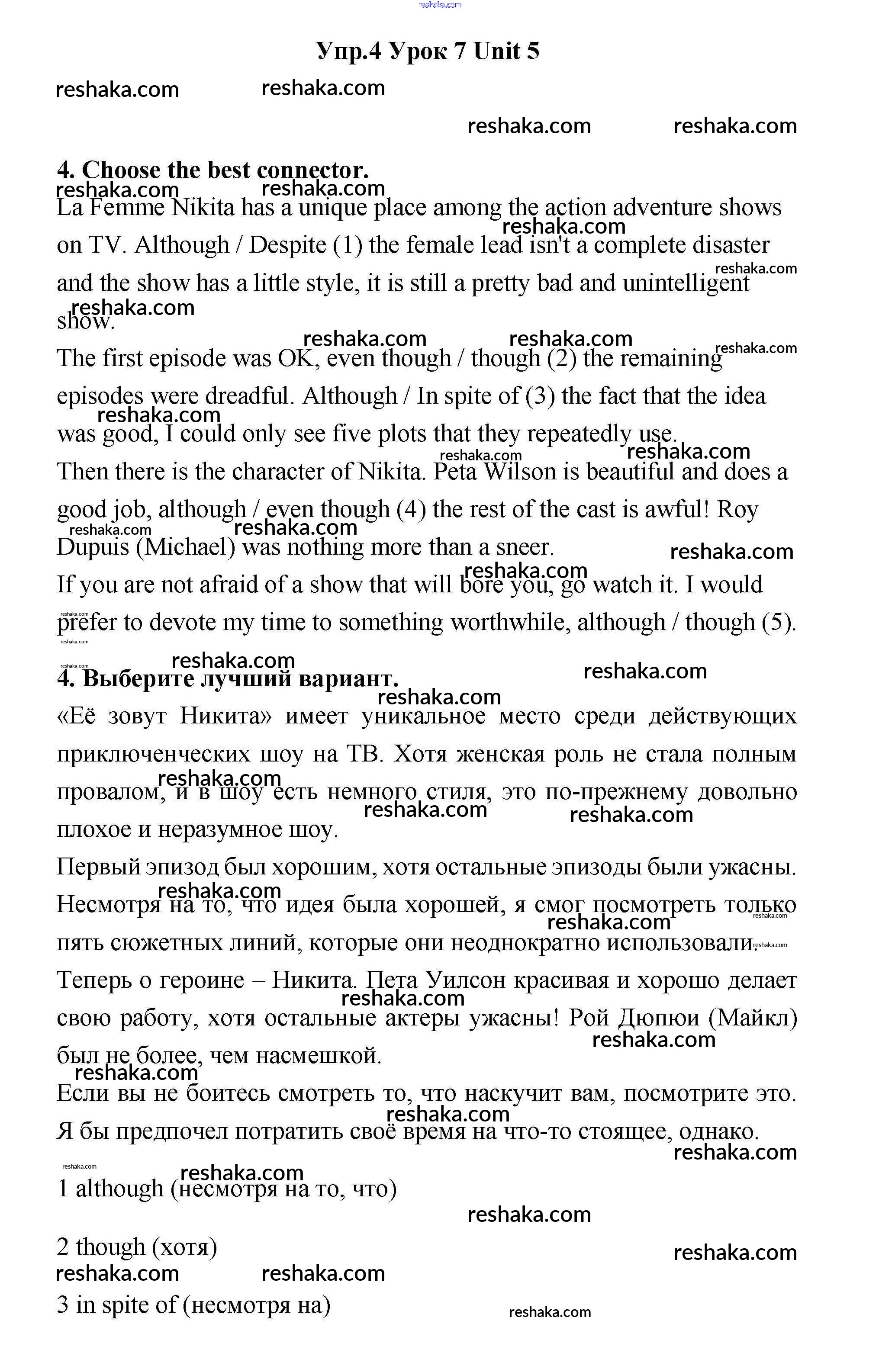 Представляем вам сборники по Английскому языку, с готовыми ответами к Учебнику Гроза школьной программы для учеников одиннадцатый класса. Это не просто гдз с ответом, а с подсказками, как верно решить lesson 7 Unit 5 4. Проверяй домашку с умом и получай высший балл!