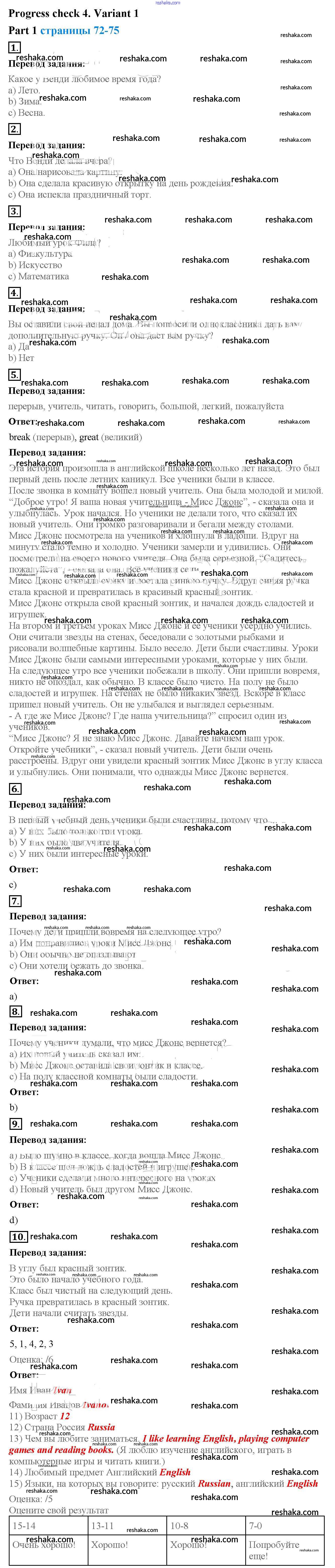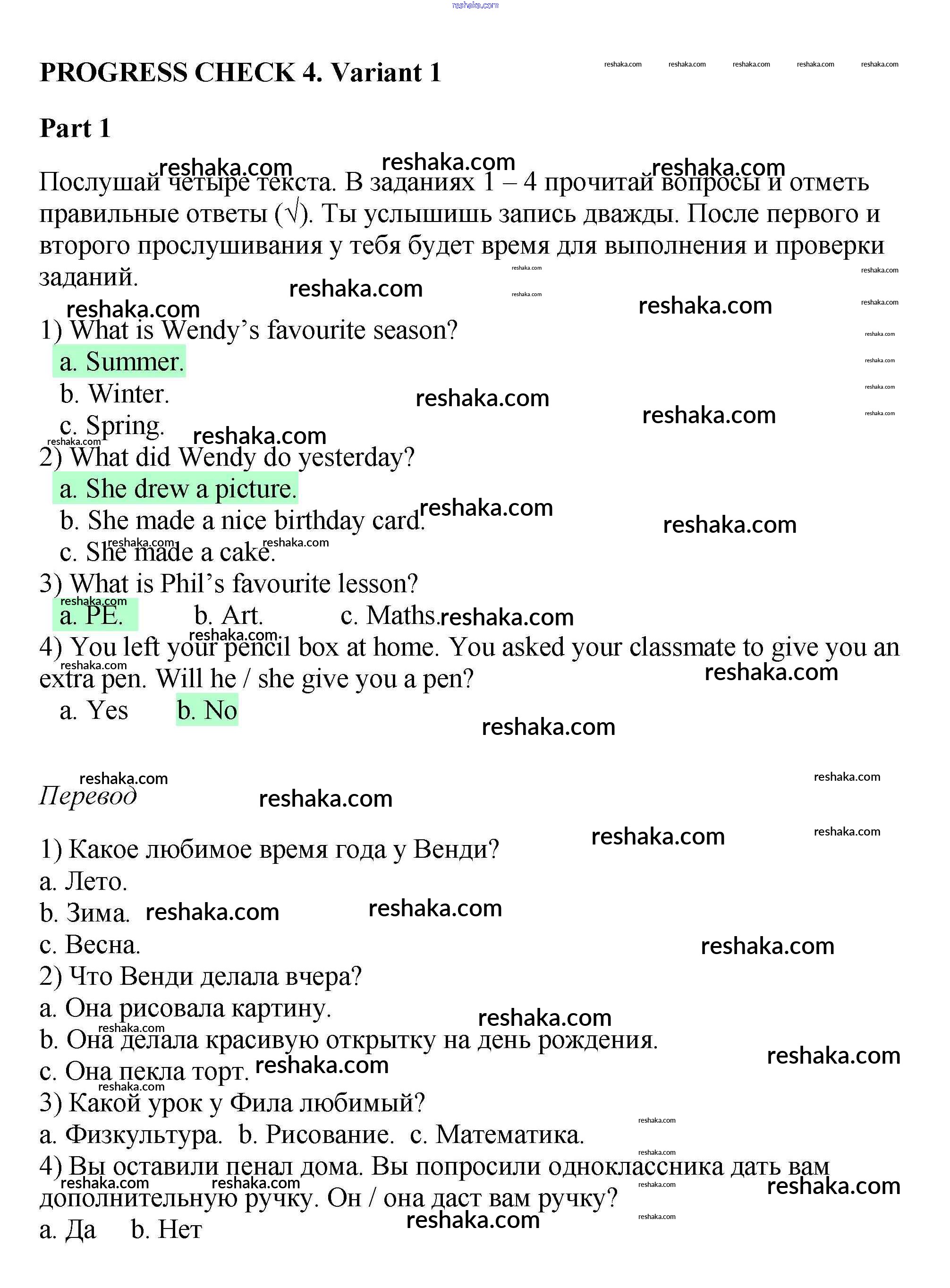 Представляем вам сборники по Английскому языку, с готовыми ответами к Рабочей тетради с контрольными работами Биболетова школьной программы для учеников четвертый класса. Это не просто гдз с ответом, а с подсказками, как верно решить Variant 1 Progress check 4 1. Проверяй домашку с умом и получай высший балл!