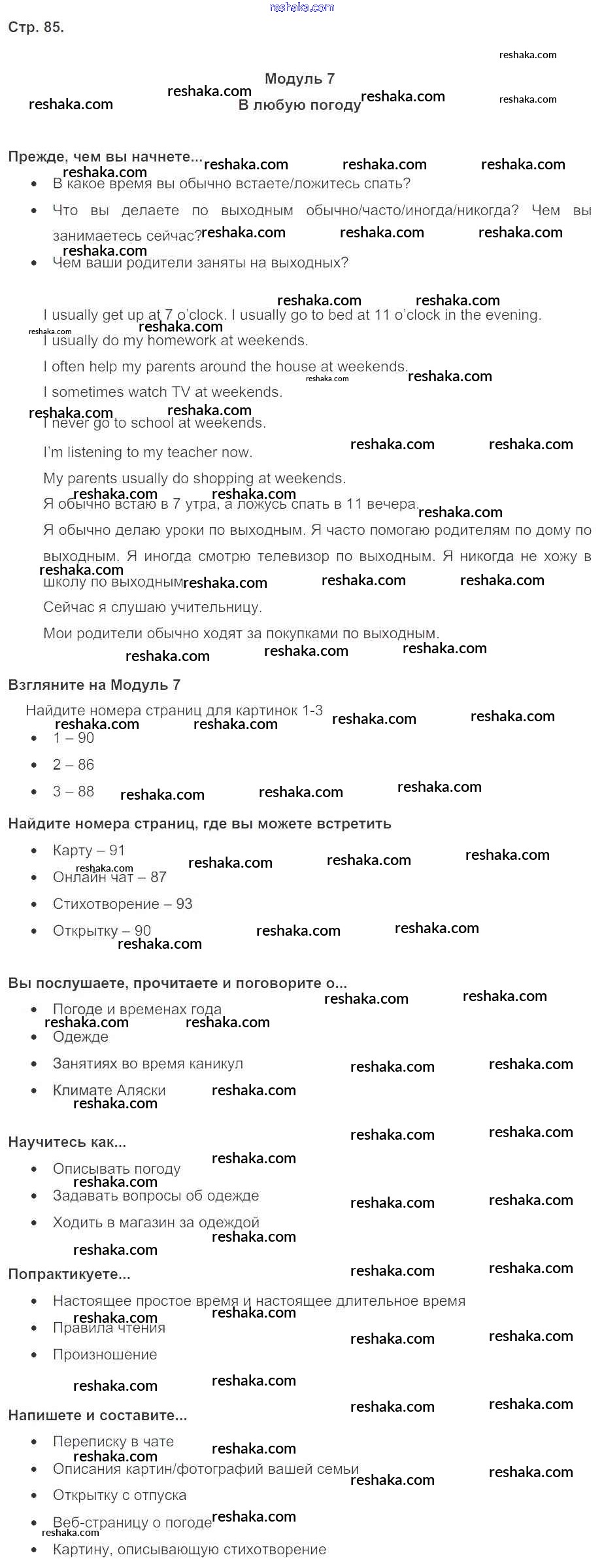 Представляем вам сборники по Английскому языку, с готовыми ответами к Учебнику Ваулина школьной программы для учеников пятый класса. Это не просто гдз с ответом, а с подсказками, как верно решить Module 7. In all weathers стр. 85. Проверяй домашку с умом и получай высший балл!