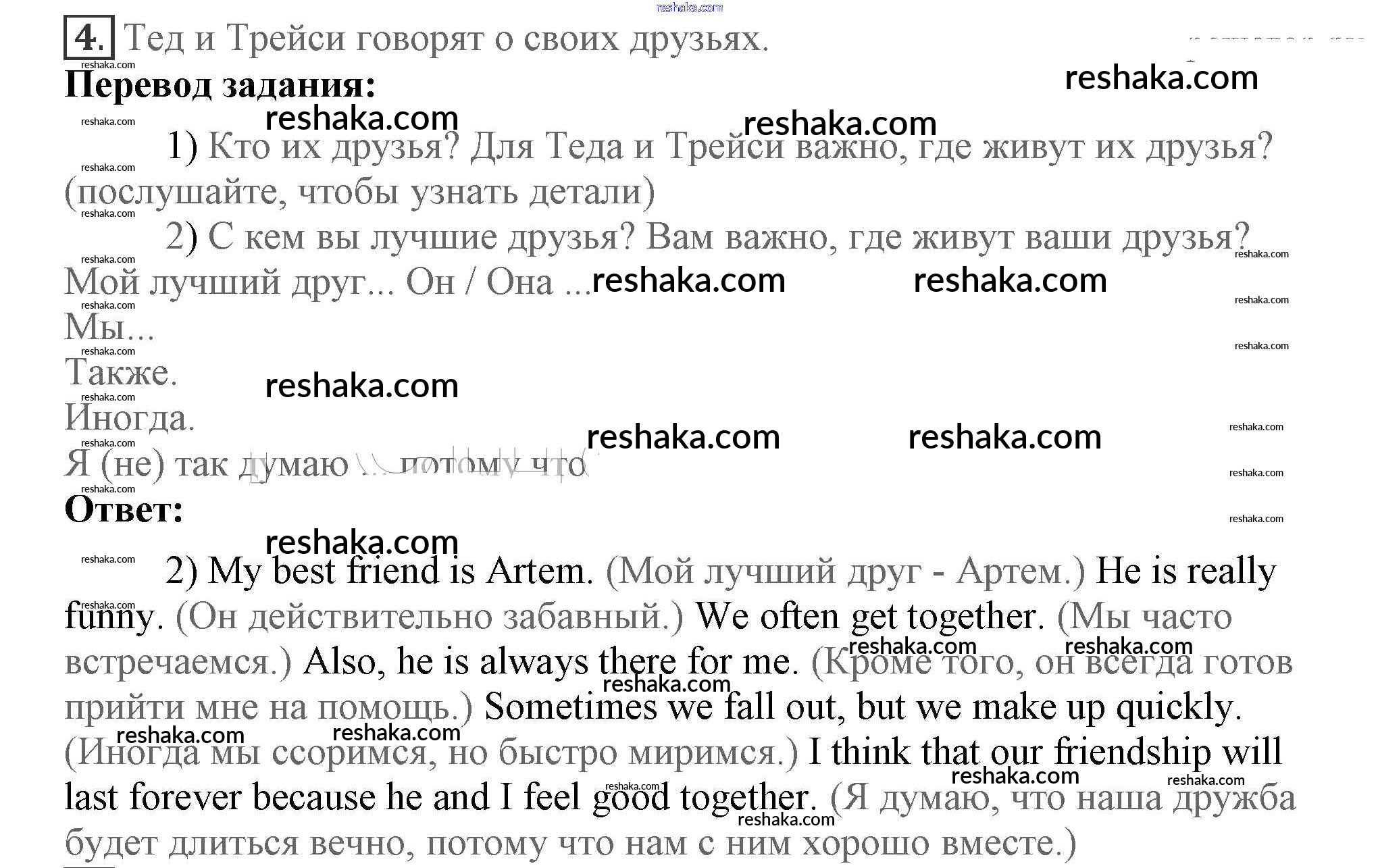 Представляем вам сборники по Английскому языку, с готовыми ответами к Учебнику Кузовлев школьной программы для учеников седьмой класса. Это не просто гдз с ответом, а с подсказками, как верно решить Lesson 1 Unit 5. Are you happy with your friends? 4. Проверяй домашку с умом и получай высший балл!