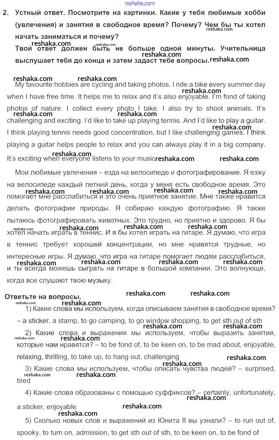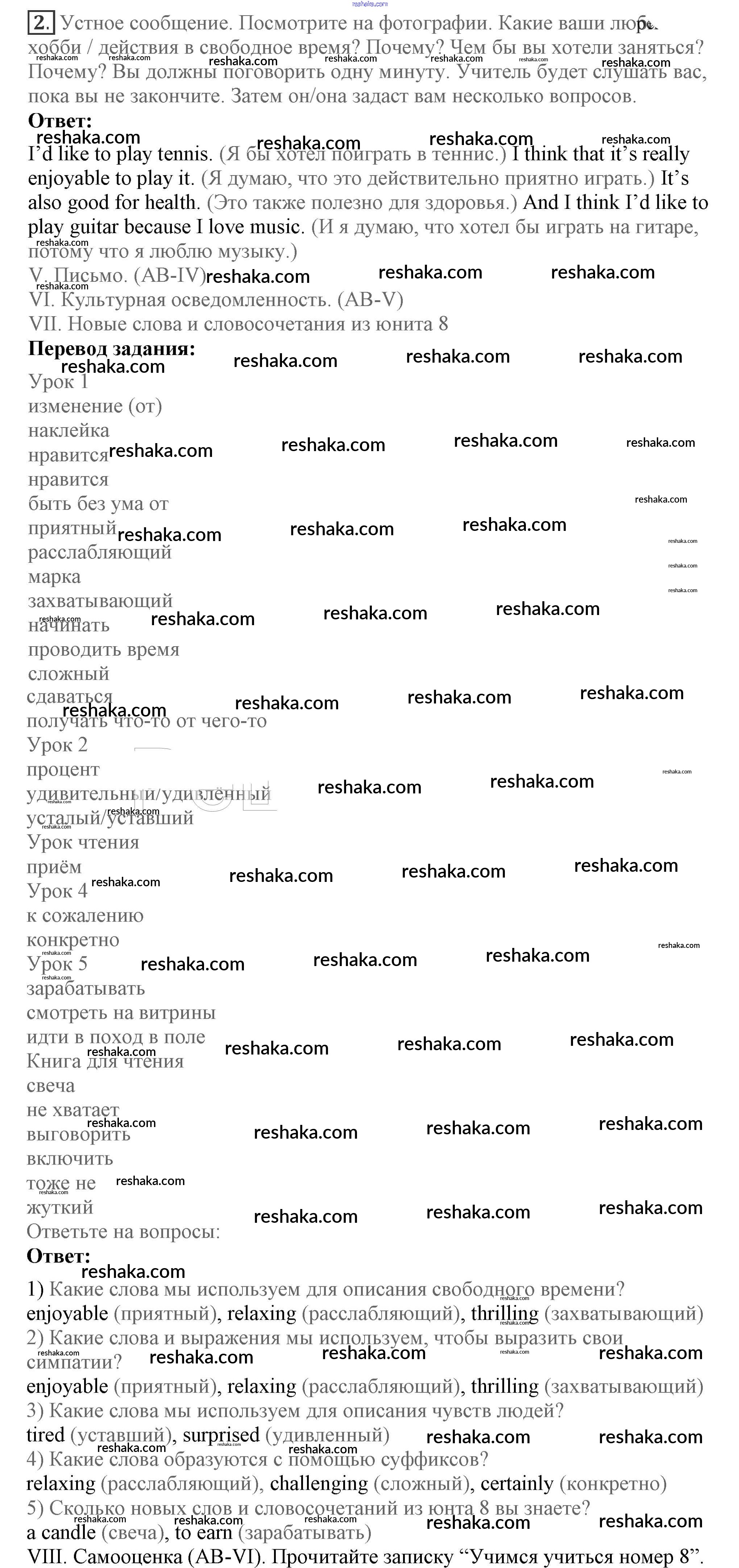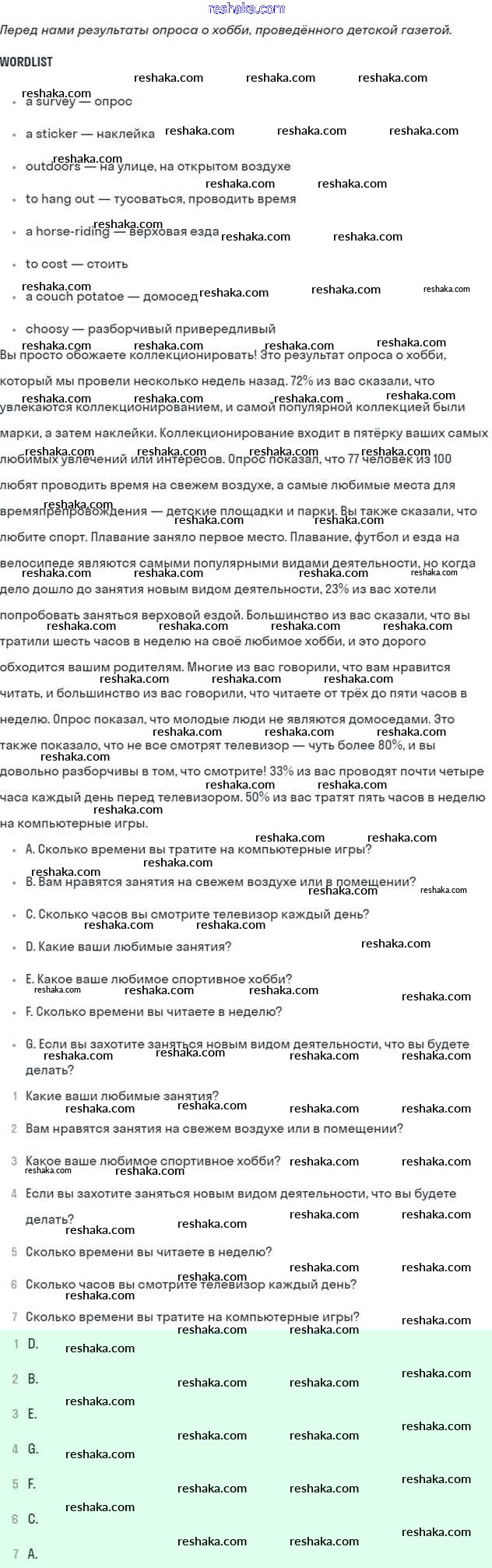 Представляем вам сборники по Английскому языку, с готовыми ответами к Учебнику Кузовлев школьной программы для учеников седьмой класса. Это не просто гдз с ответом, а с подсказками, как верно решить Lesson 7 Unit 8. How do you spend your free time? 2. Проверяй домашку с умом и получай высший балл!