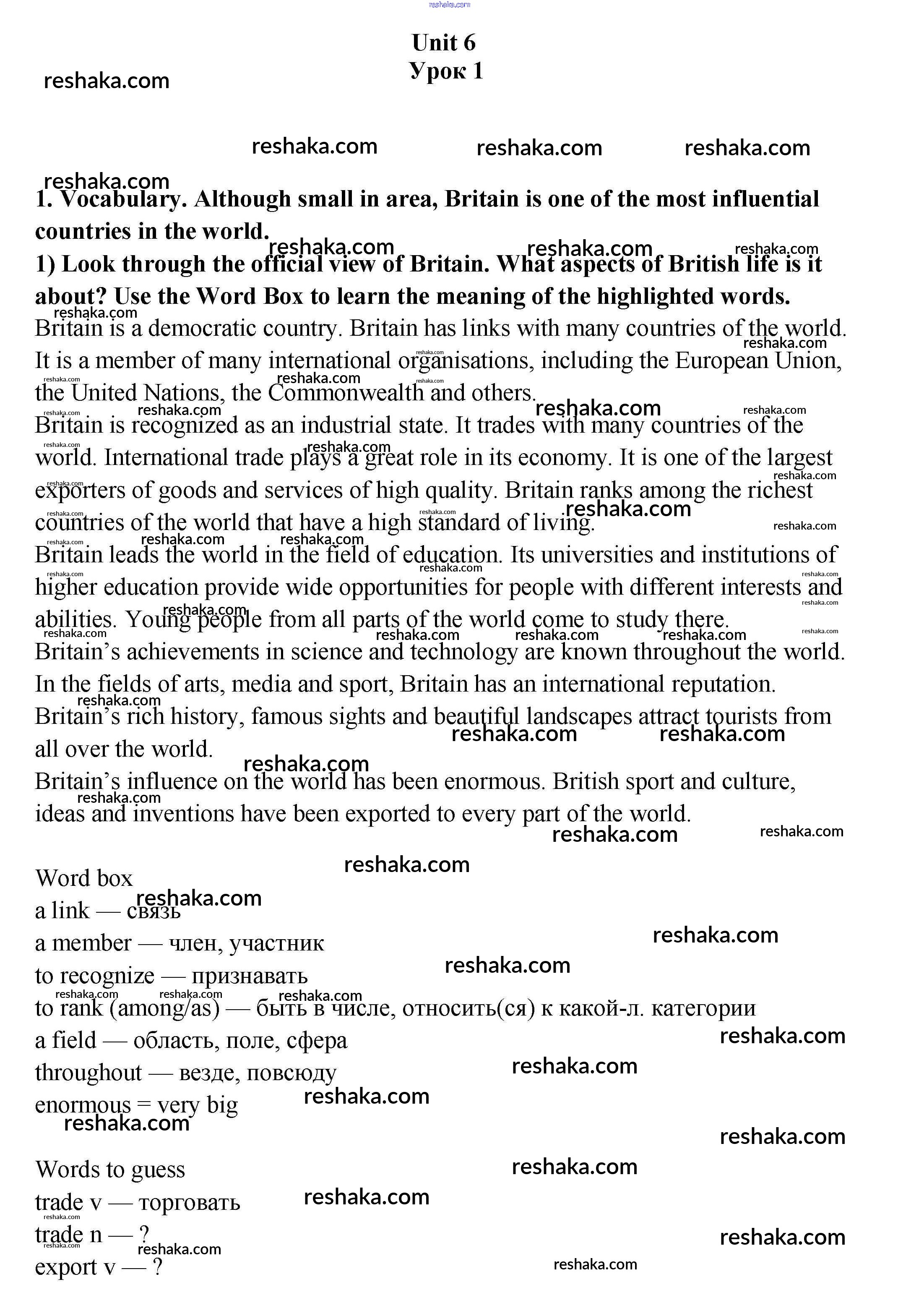 Представляем вам сборники по Английскому языку, с готовыми ответами к Учебнику Кузовлев школьной программы для учеников девятый класса. Это не просто гдз с ответом, а с подсказками, как верно решить Урок 1 Unit 6. My country in the world 1. Проверяй домашку с умом и получай высший балл!