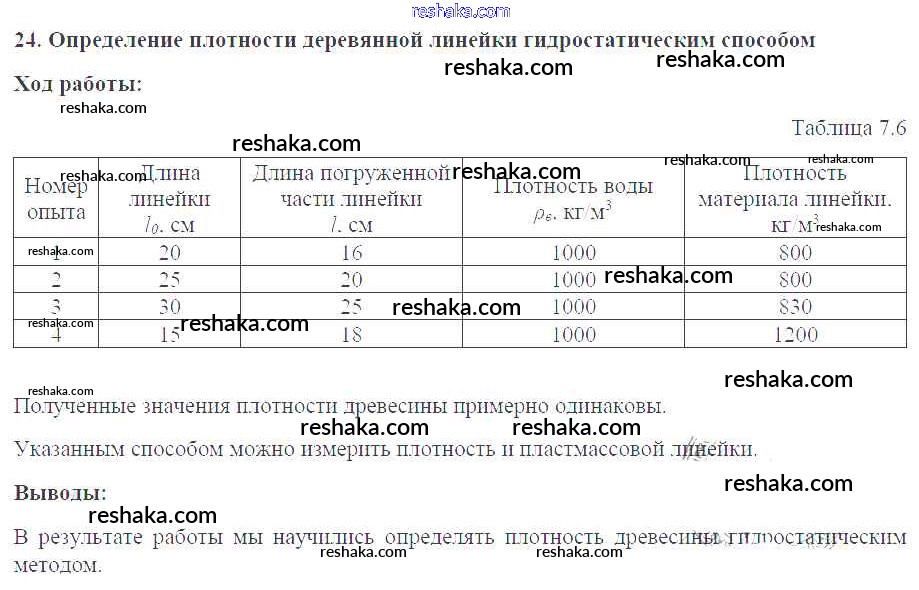 Решака - онлайн ответы Физика Белага, Воронцова за 7 класс Тетрадь-практикум ФГОС 2012 - №24. Определение плотности деревянной линейки гидростатическим способом