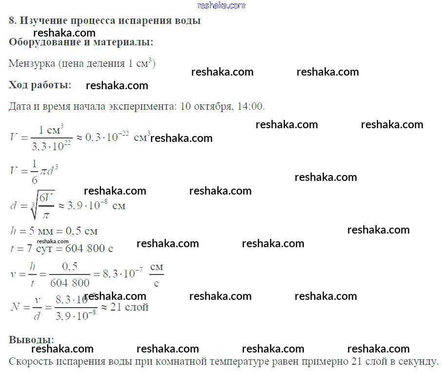 Решака - онлайн ответы Физика Белага, Воронцова за 7 класс Тетрадь-практикум ФГОС 2012 - №8. Изучение процесса испарения воды