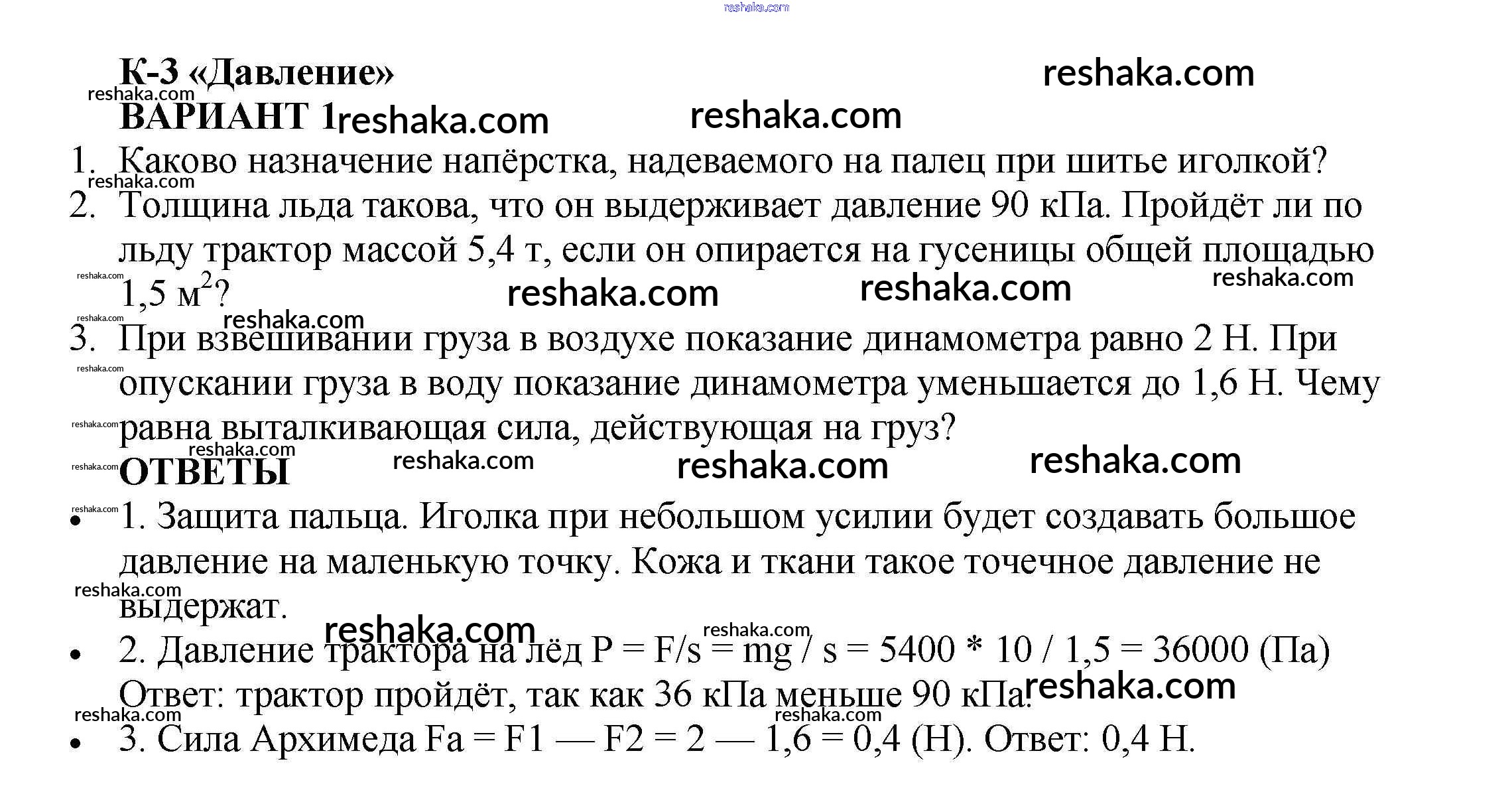 контрольная работа / кр №-3. давление твердых тел, жидкостей и газов / вариант №1