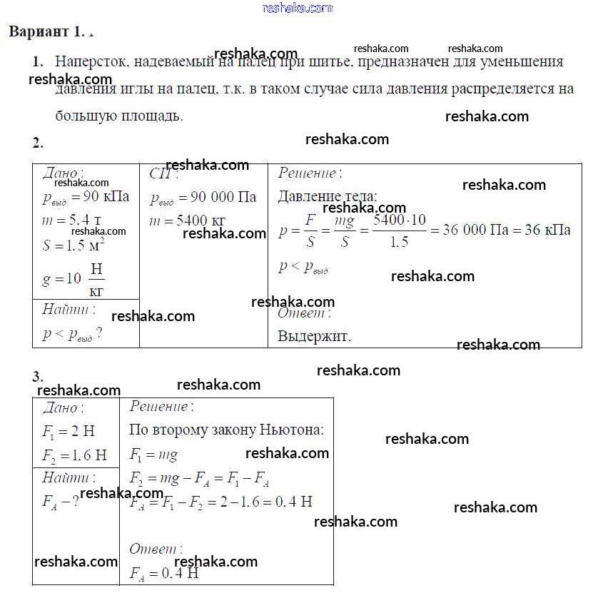 Решака - онлайн ответы Физика Марон за 7 класс Самостоятельные и контрольные работы ФГОС 2016 - Вариант №1