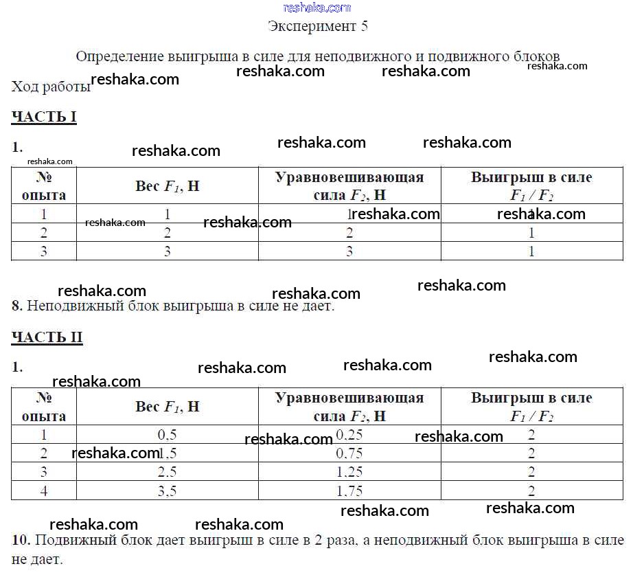 Решака - онлайн ответы Физика Минькова, Иванова за 7 класс Тетрадь для лабораторных работ ФГОС 2017 - Эксперимент 5. Определение выигрыша в силе для подвижного и неподвижного блоков