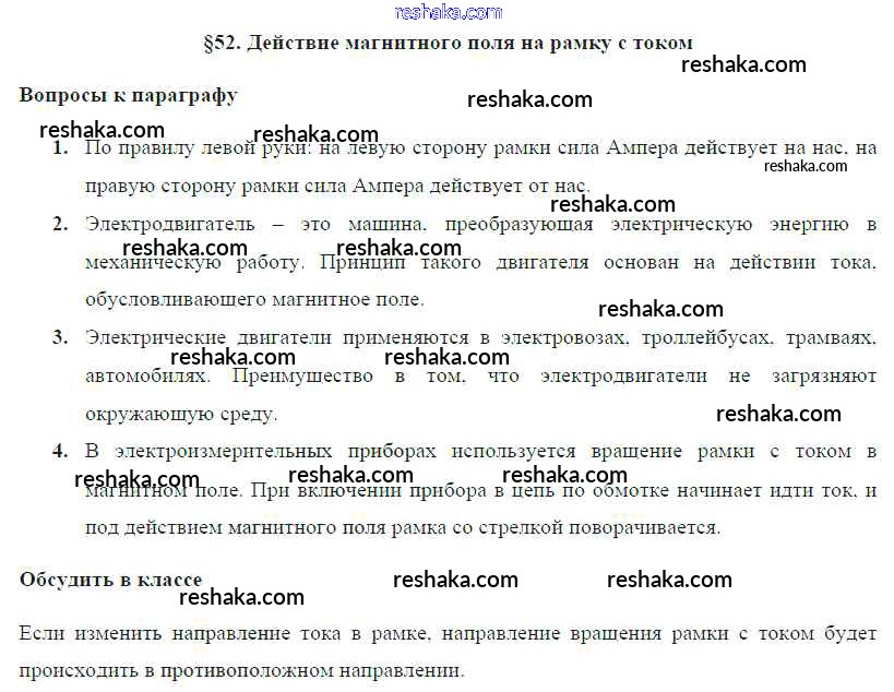 Решака - онлайн ответы Физика Громов, Родина за 8 класс Учебник ФГОС 2018 - § 52. Действие магнитного поля на рамку с током