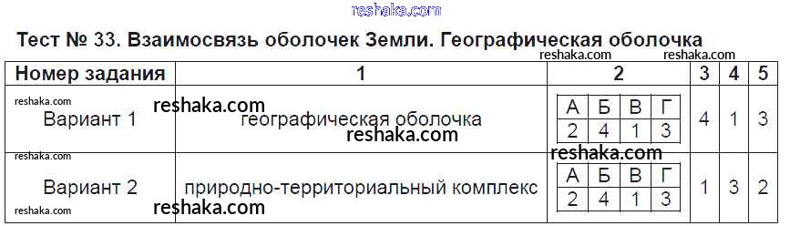 Решака - онлайн ответы География Пятунина, Пятунин за 6 класс Тесты ФГОС 2017 - Тест-33. Взаимосвязь оболочек Земли. Географическая оболочка