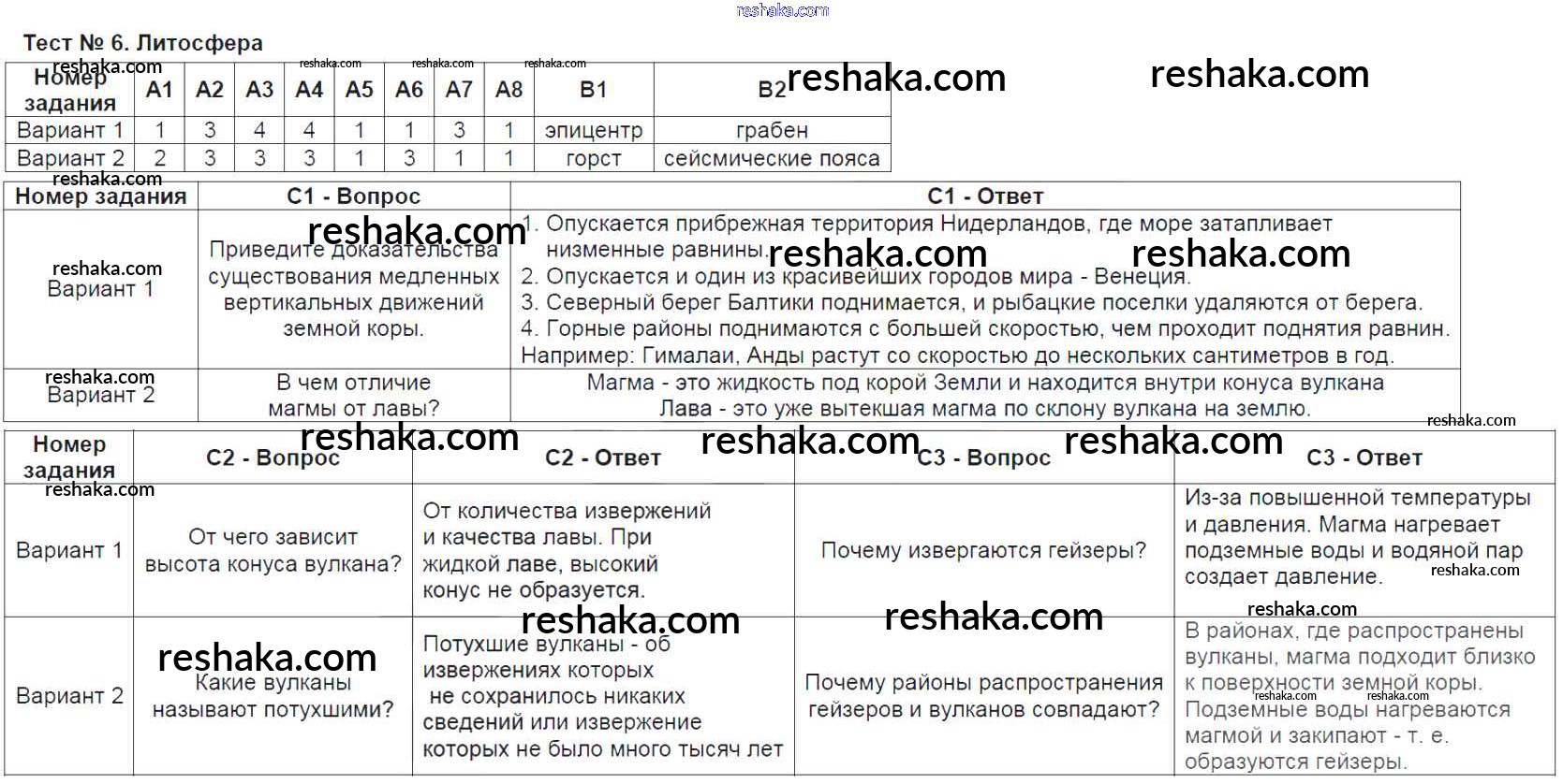 Решака - онлайн ответы География Жижина за 6 класс Контрольно-измерительные материалы (КИМ) ФГОС 2018 - Тест-6. Литосфера
