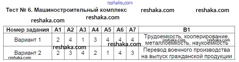 Решака - онлайн ответы География Жижина за 9 класс Контрольно-измерительные материалы (КИМ) ФГОС 2017 - Тест №6. Машиностроительный комплекс