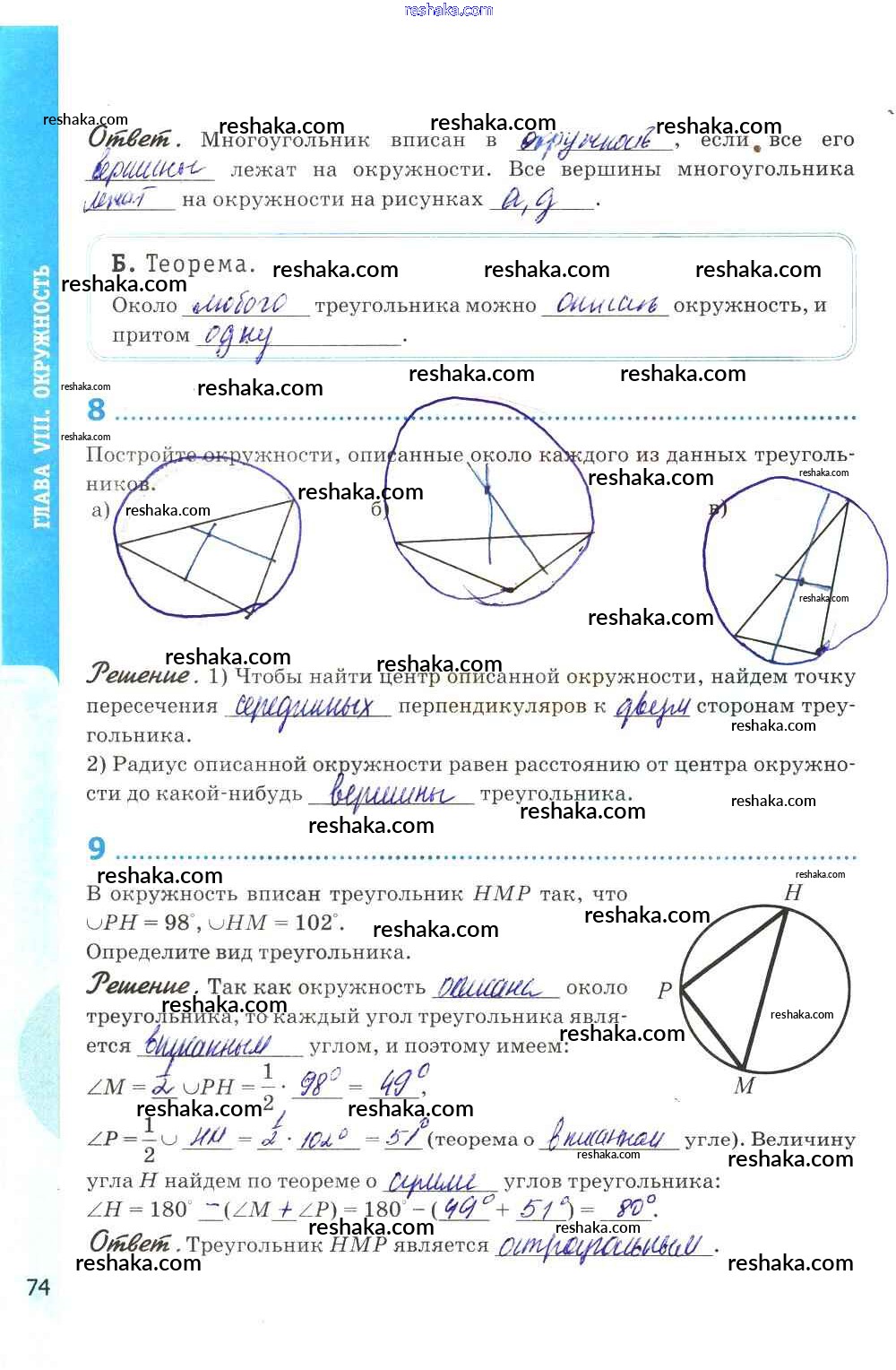 Представляем вам сборники по Геометрии, с готовыми ответами к Рабочей тетради Глазков школьной программы для учеников восьмой класса. Это не просто гдз с ответом, а с подсказками, как верно решить Глава VIII. Окружность стр. 74. Проверяй домашку с умом и получай высший балл!