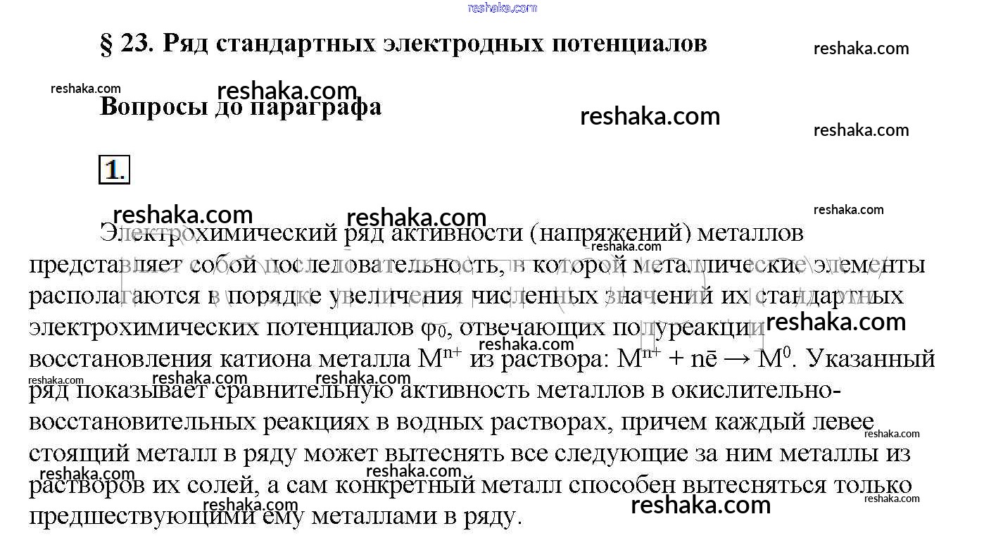 Представляем вам сборники по Химии, с готовыми ответами к Учебнику Рудзитис школьной программы для учеников одиннадцатый класса. Это не просто гдз с ответом, а с подсказками, как верно решить Вопросы до параграфа § 23. Ряд стандартных электродных потенциалов 1. Проверяй домашку с умом и получай высший балл!