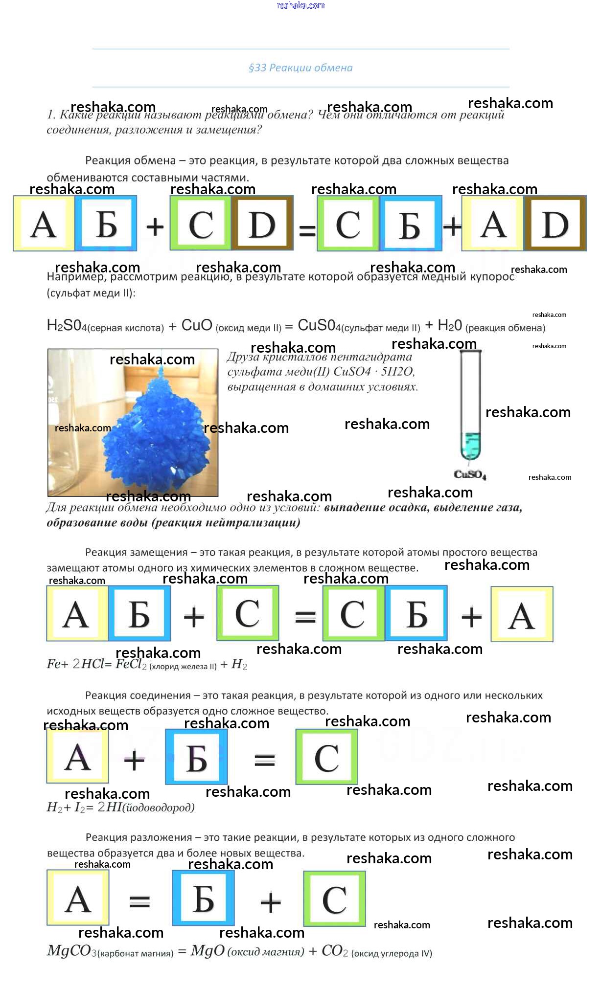 Представляем вам сборники по Химии, с готовыми ответами к Учебнику Габриелян школьной программы для учеников восьмой класса. Это не просто гдз с ответом, а с подсказками, как верно решить §33. Реакции обмена 1. Проверяй домашку с умом и получай высший балл!