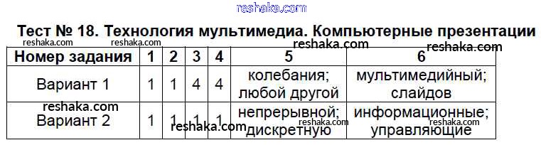 Решака - онлайн ответы Информатика Масленикова за 7 класс Контрольно-измерительные материалы (КИМ) ФГОС 2017 - Тест №18. Технология мультимедиа. Компьютерные презентации