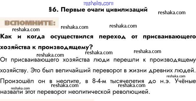 Представляем вам сборники по Истории, с готовыми ответами к Учебнику Уколова школьной программы для учеников пятый класса. Это не просто гдз с ответом, а с подсказками, как верно решить Вспомните §6. Первые очаги цивилизаций 1. Проверяй домашку с умом и получай высший балл!