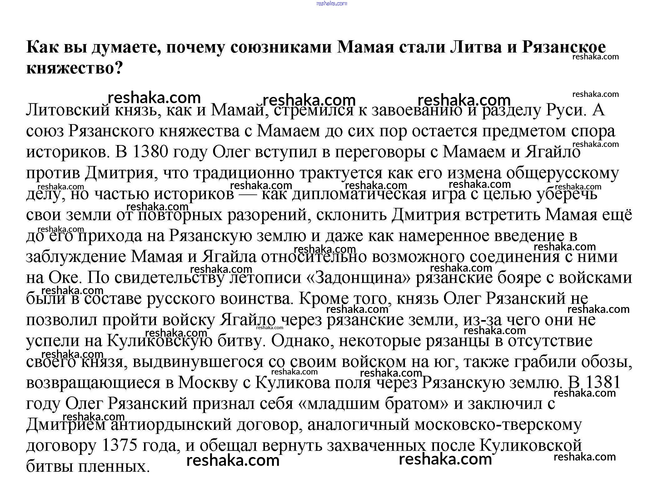 Представляем вам сборники по Истории, с готовыми ответами к Учебнику Арсентьев школьной программы для учеников шестой класса. Это не просто гдз с ответом, а с подсказками, как верно решить Вопросы в тексте §21. Объединение русских земель вокруг Москвы. Куликовская битва 4. Проверяй домашку с умом и получай высший балл!