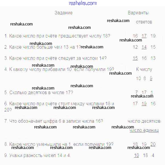 Выбери правильный ответ и подчеркни его. Варианты ответов К числу 10 8 9 число десятков число единиц
