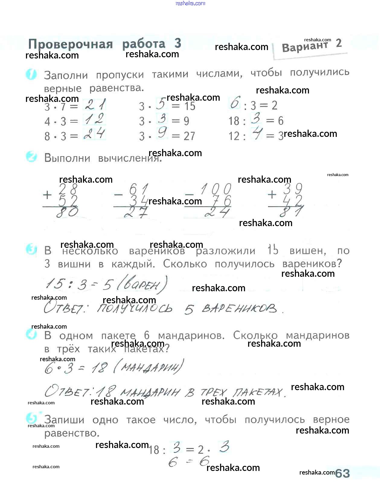 Решака - онлайн ответы Математика Волкова за 2 класс Проверочные работы ФГОС 2014 - 63