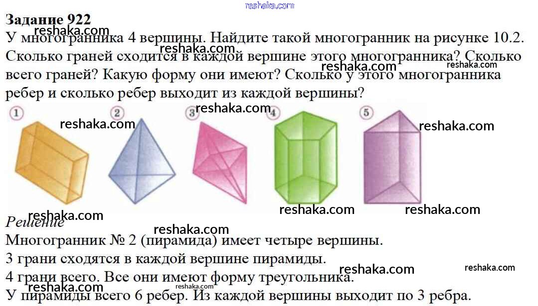 Представляем вам сборники по Математике, с готовыми ответами к Учебнику Дорофеев школьной программы для учеников пятый класса. Это не просто гдз с ответом, а с подсказками, как верно решить 10.1. Геометрические тела и их изображение Глава 10. Многогранники 922. Проверяй домашку с умом и получай высший балл!