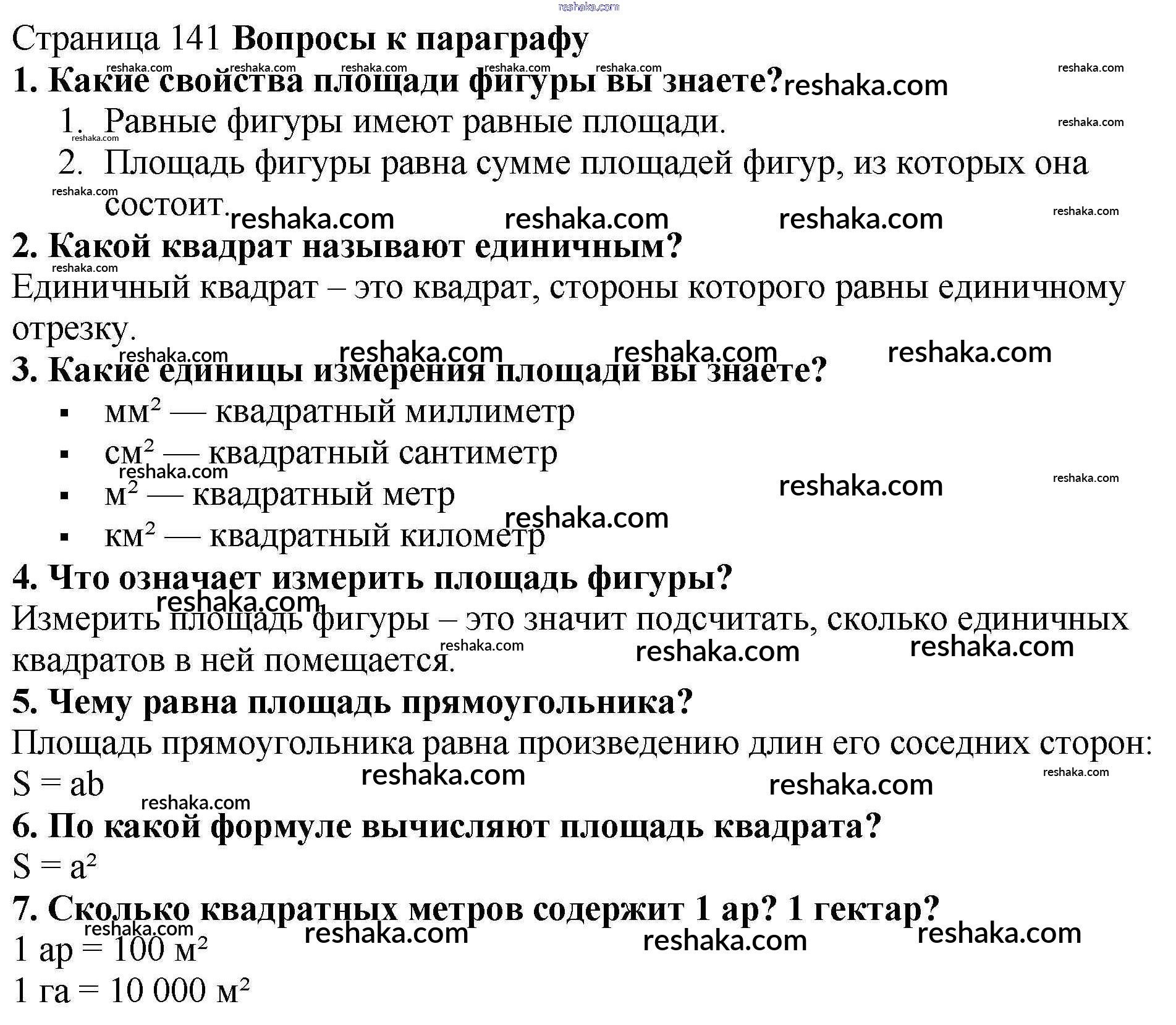 Представляем вам сборники по Математике, с готовыми ответами к Учебнику Мерзляк школьной программы для учеников пятый класса. Это не просто гдз с ответом, а с подсказками, как верно решить Вопросы (страница 141) §21. Площадь. Площадь прямоугольника страница 141. Проверяй домашку с умом и получай высший балл!
