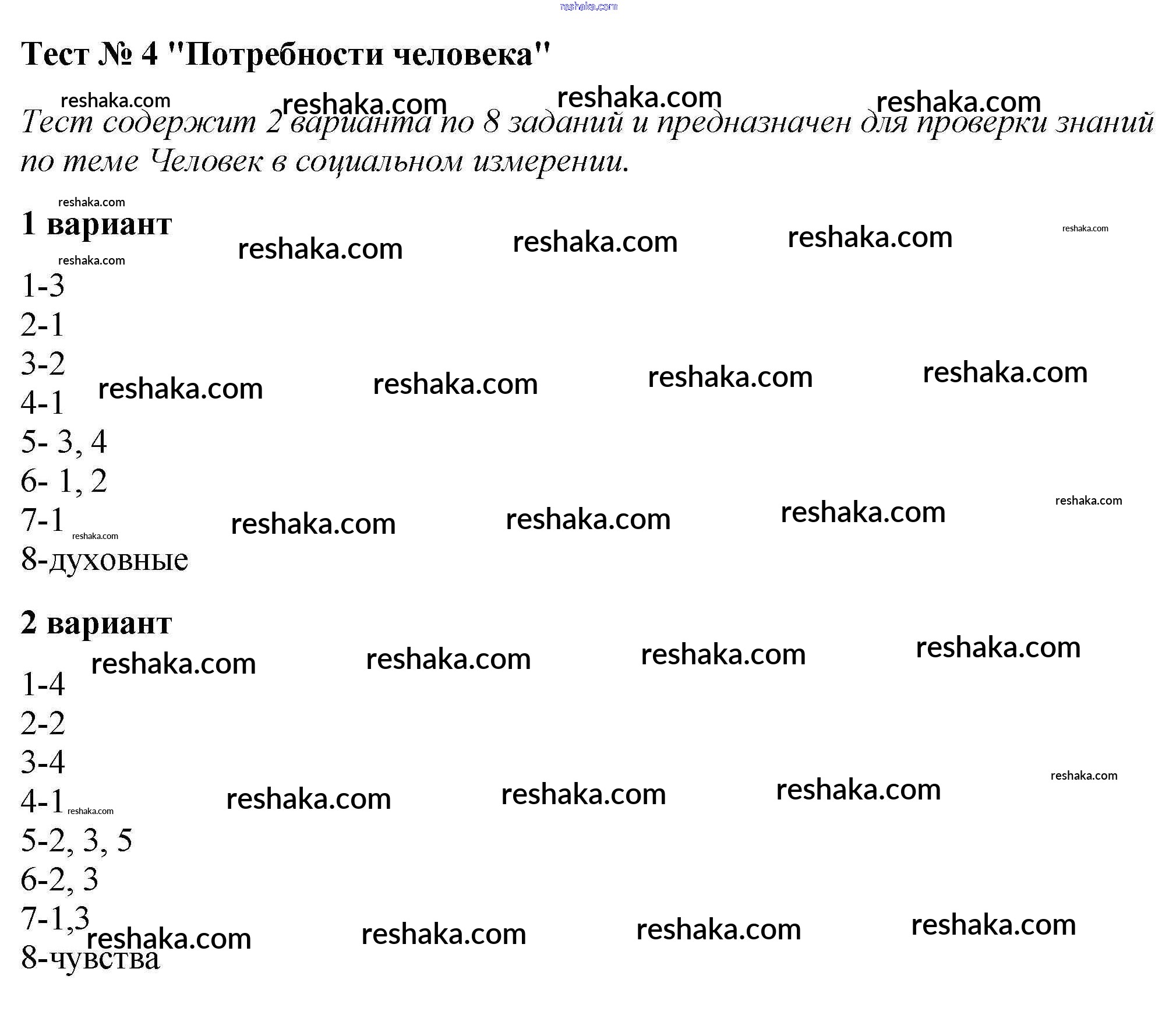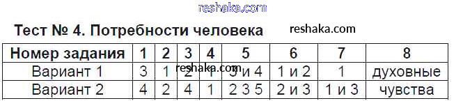 Решака - онлайн ответы Обществознание Коваль за 6 класс Тесты ФГОС 2016 - Тест №4. Потребности человека