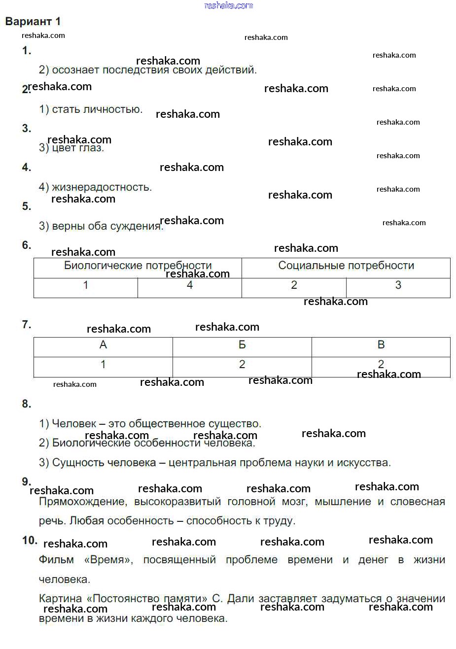 Решака - онлайн ответы Обществознание Лобанов за 5-6 класс Тематический контроль ФГОС 2017 - вариант-1