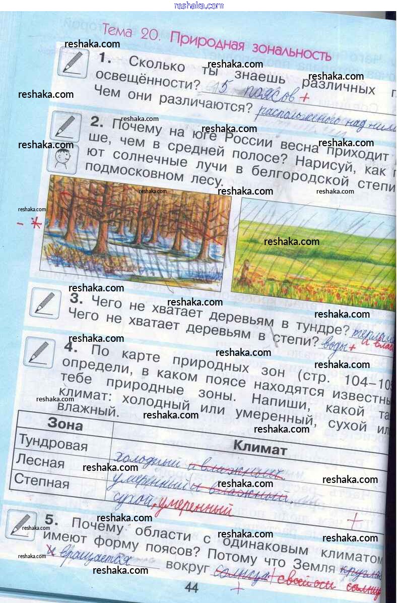 Представляем вам сборники по Окружающему миру, с готовыми ответами к Рабочей тетради Вахрушев школьной программы для учеников второй класса. Это не просто гдз с ответом, а с подсказками, как верно решить Тема 20. Природная зональность стр. 44. Проверяй домашку с умом и получай высший балл!