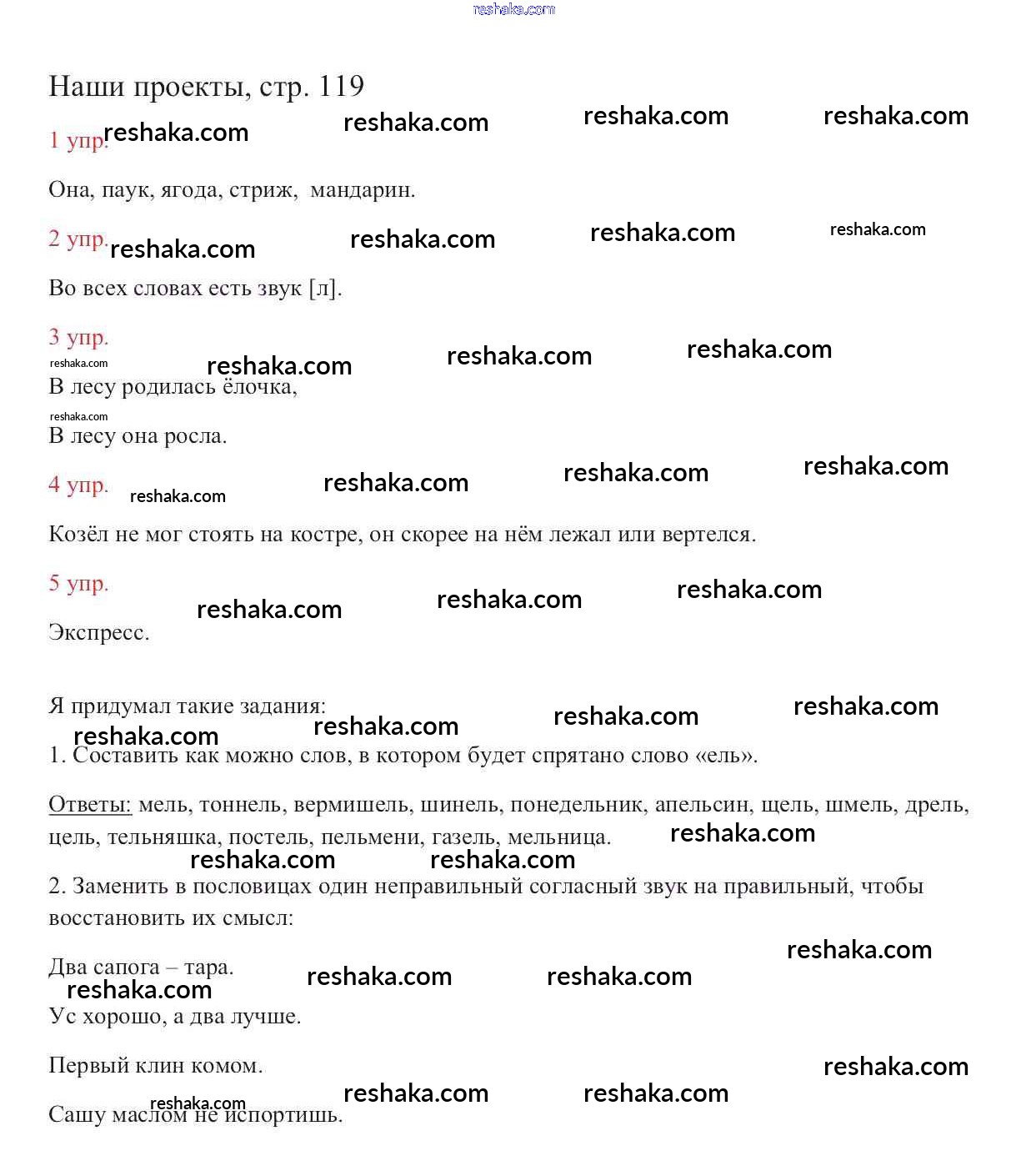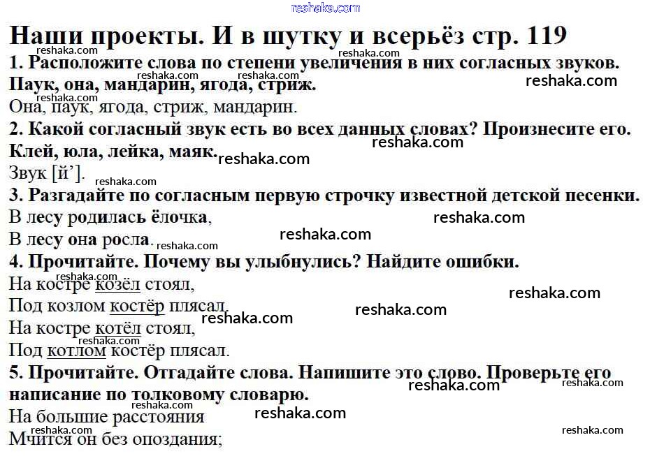 Представляем вам сборники по Русскому языку, с готовыми ответами к Учебнику Канакина школьной программы для учеников второй класса. Это не просто гдз с ответом, а с подсказками, как верно решить Наши проекты Часть №1 (Упражнения) стр. 119. Проверяй домашку с умом и получай высший балл!