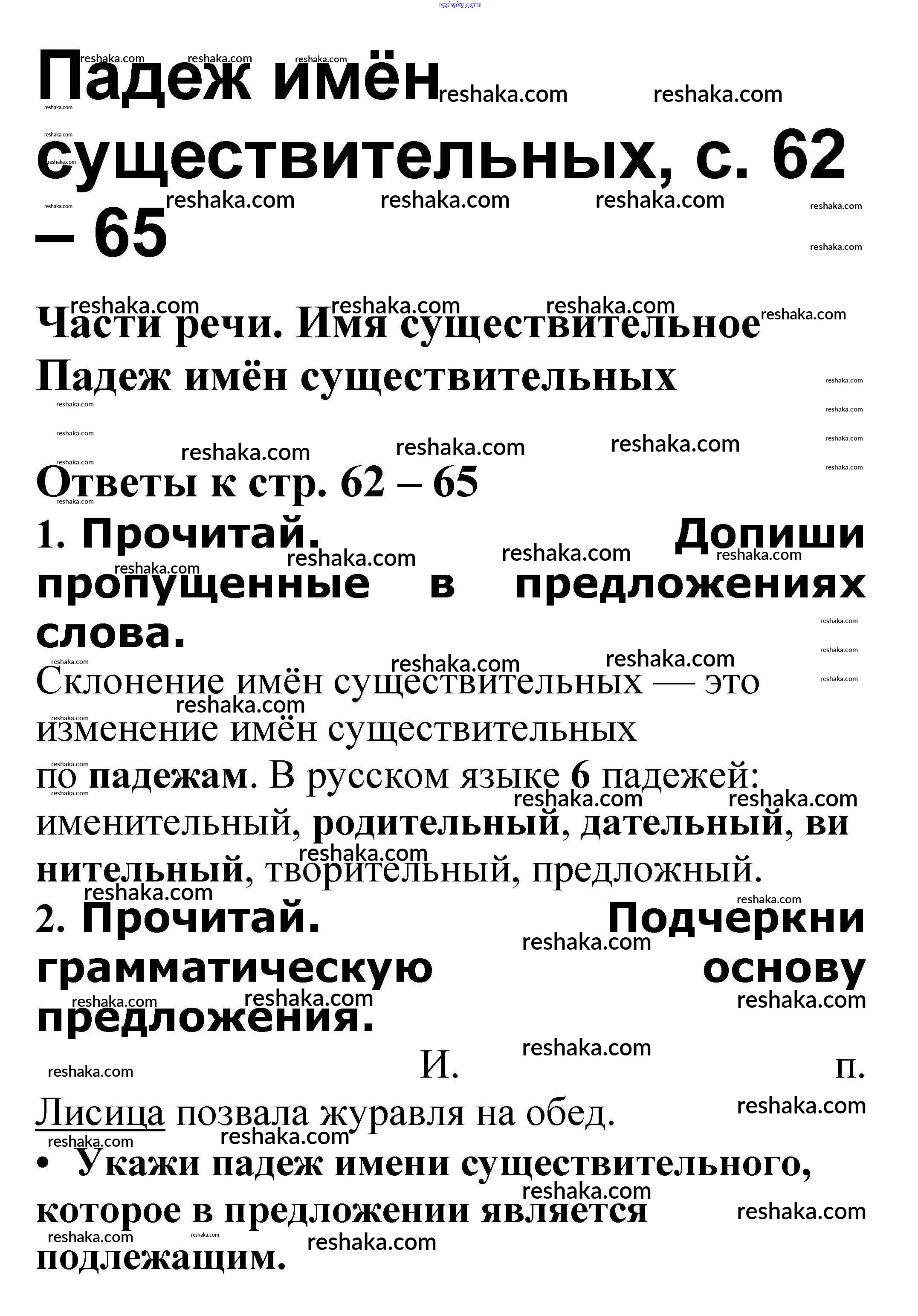 Решака - онлайн ответы Русский язык Канакина, Щеголева за 3 класс Проверочные работы ФГОС 2018 - Падеж имён существительных стр. 62 – 65