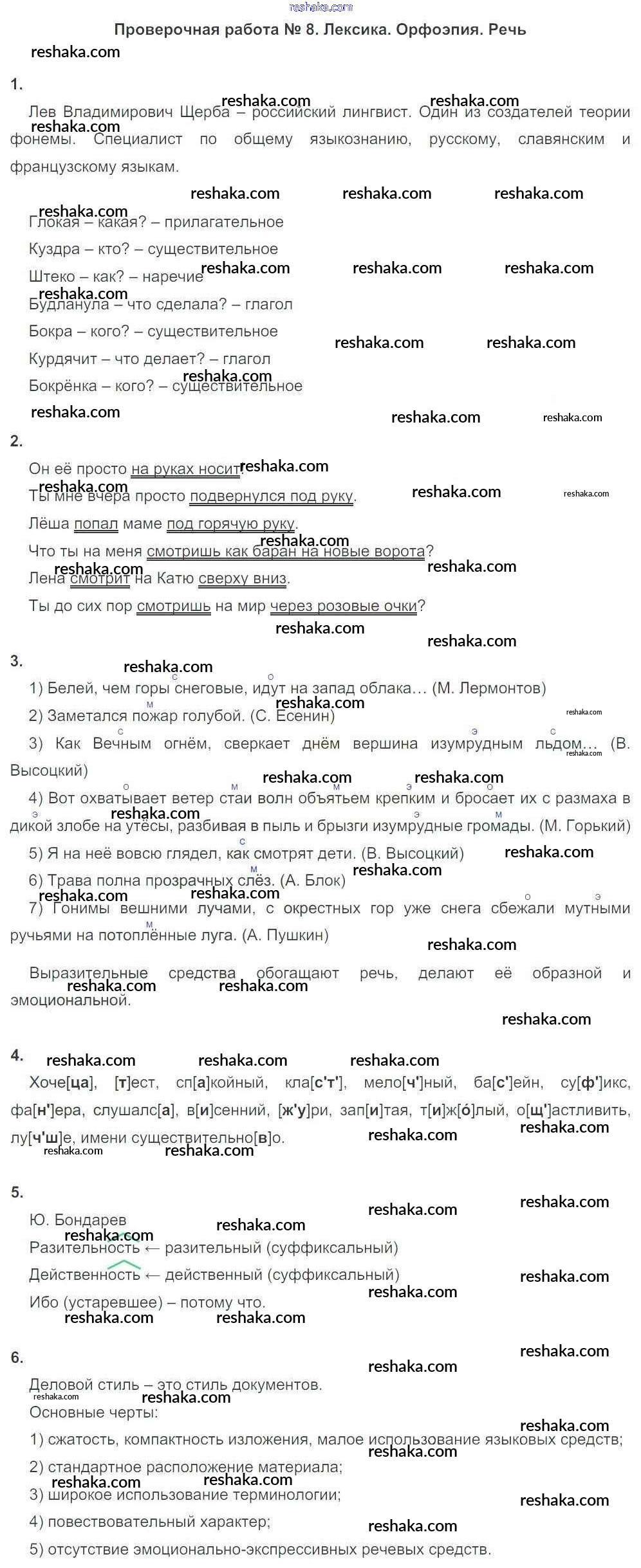 Решака - онлайн ответы Русский язык Львов за 6 класс Тетрадь для оценки качества знаний ФГОС 2015 - ПР №8. Лексика. Орфоэпия. Речь